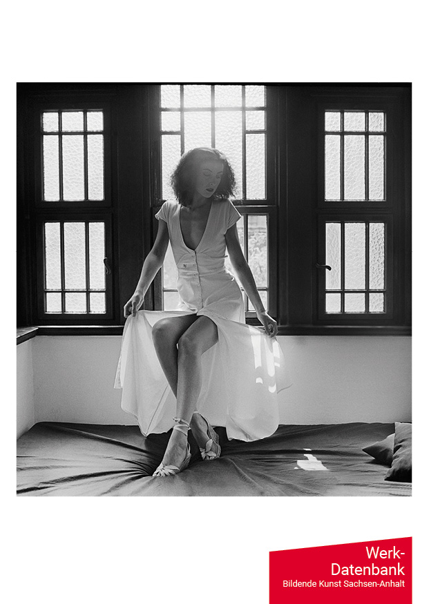 Objektbeschreibung: schwarz-weiß Fotografie einer zentral vor einer dreigeteilten Fensterwand sitzend positionierten Frau; die Porträtierte hält die Augen geschlossen und den Kopf nach links geneigt; in beiden Händen hält sie den Saum eines nach vorn geöffneten Rockes