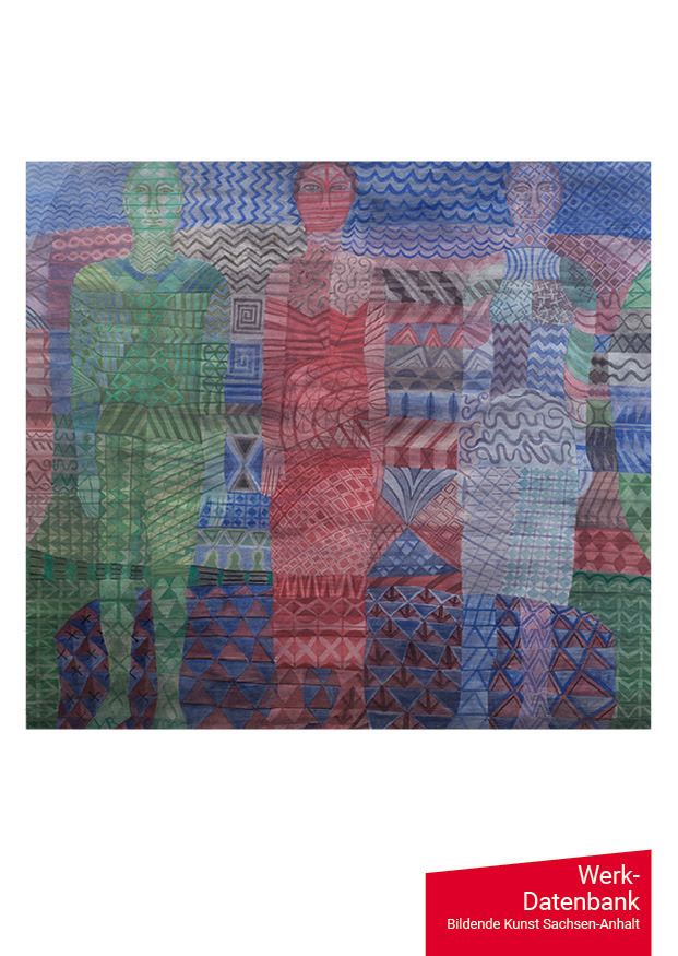 Objektbeschreibung: gerahmt, im Passepartout; drei aufrecht stehende und die ganze Bildhöhe einnehmende Figuren in frontaler Darstellung (jeweils in grün, rot und blau gehaltene Figuren), Bildfläche durch farbliche Ornamente strukturiert